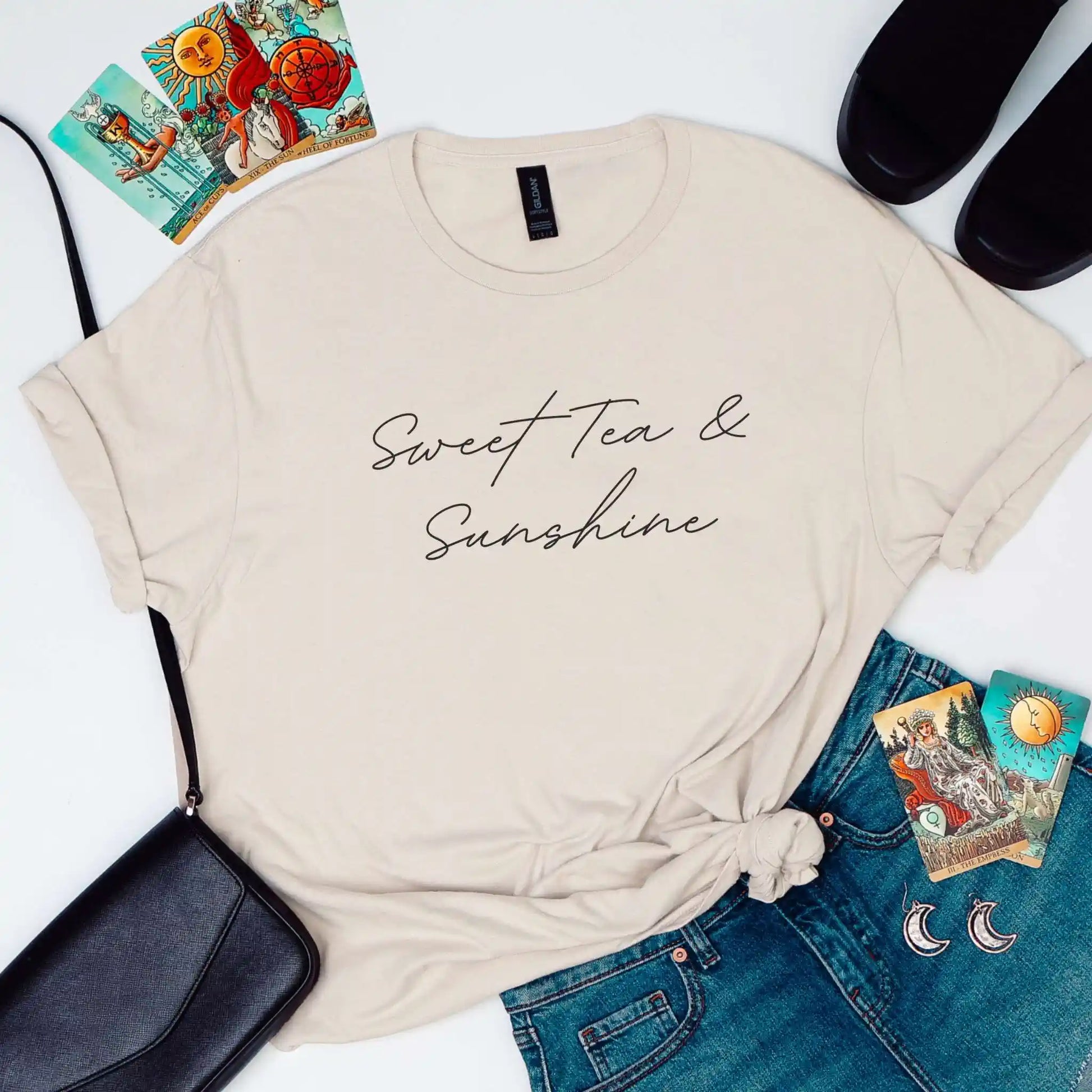 Designed in a casual handwritten script, “Sweet Tea & Sunshine” floats gently across the chest. The typography feels relaxed and full of warmth — like a summer breeze through an open screen door.