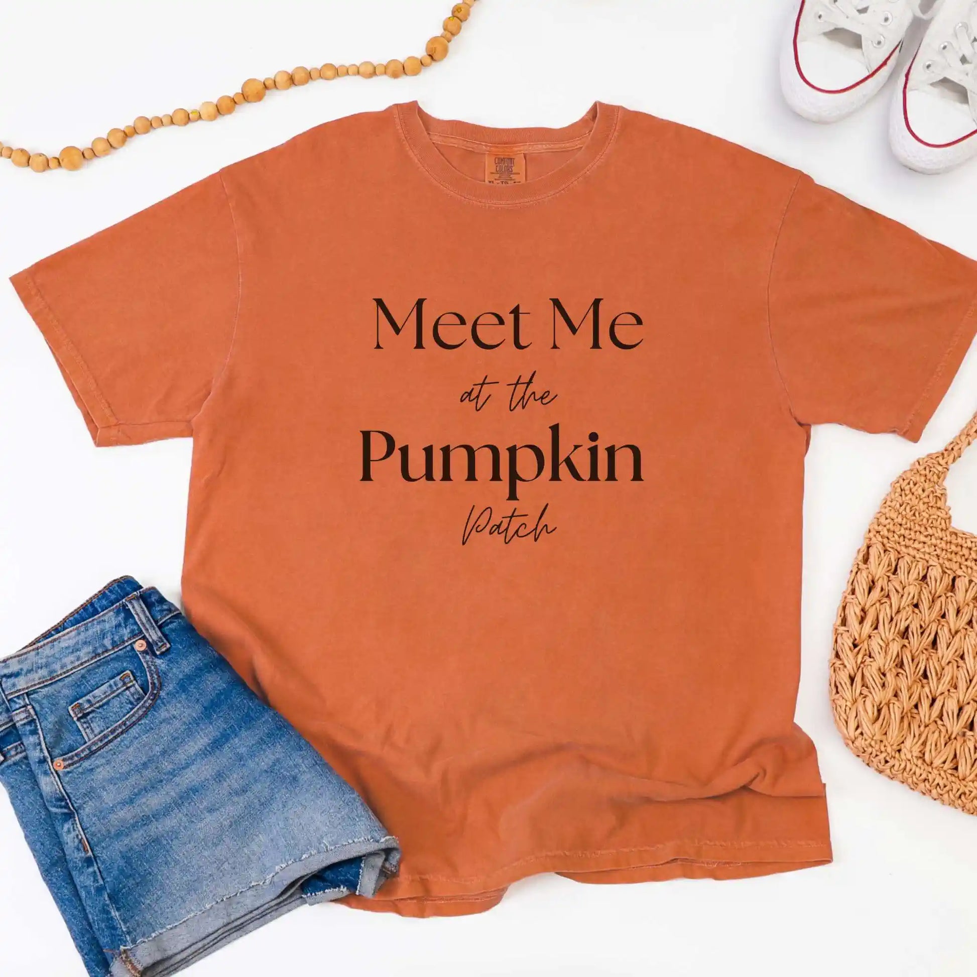 Design Details: Features the phrase “Meet Me at the Pumpkin Patch” in elegant, oversized text. This front-printed graphic t-shirt is a chic way to celebrate fall while keeping your outfit timeless and versatile — perfect for photos, hayrides, and weekends at the orchard.