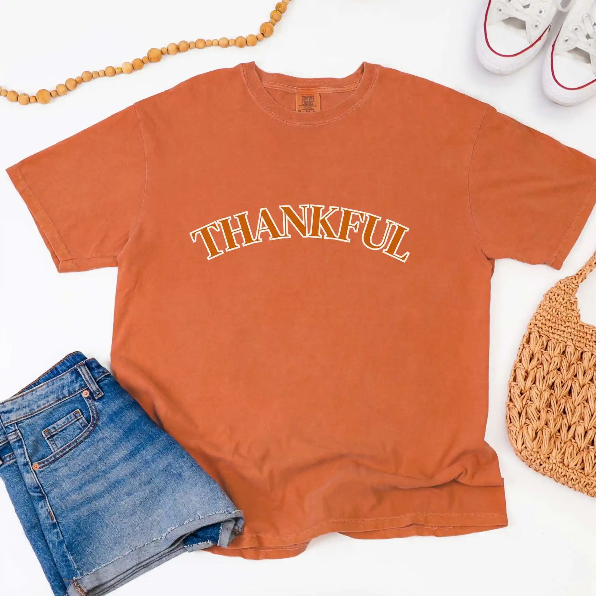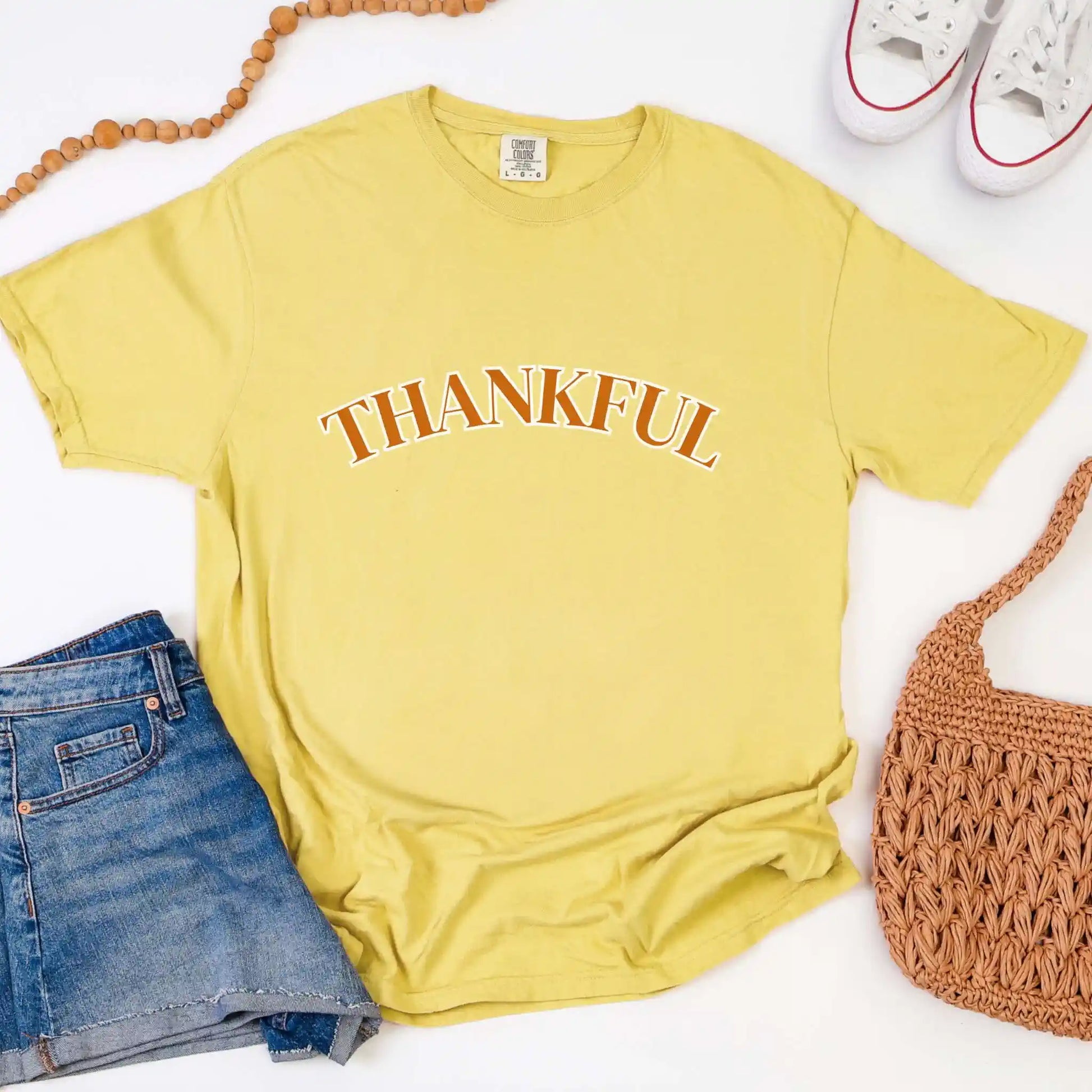 Carry the spirit of the season with this timeless “Thankful” design. Bold autumn-toned lettering in a classic arched style makes this shirt a simple yet meaningful reminder of gratitude. It’s understated, versatile, and perfectly in step with the warmth of fall gatherings.