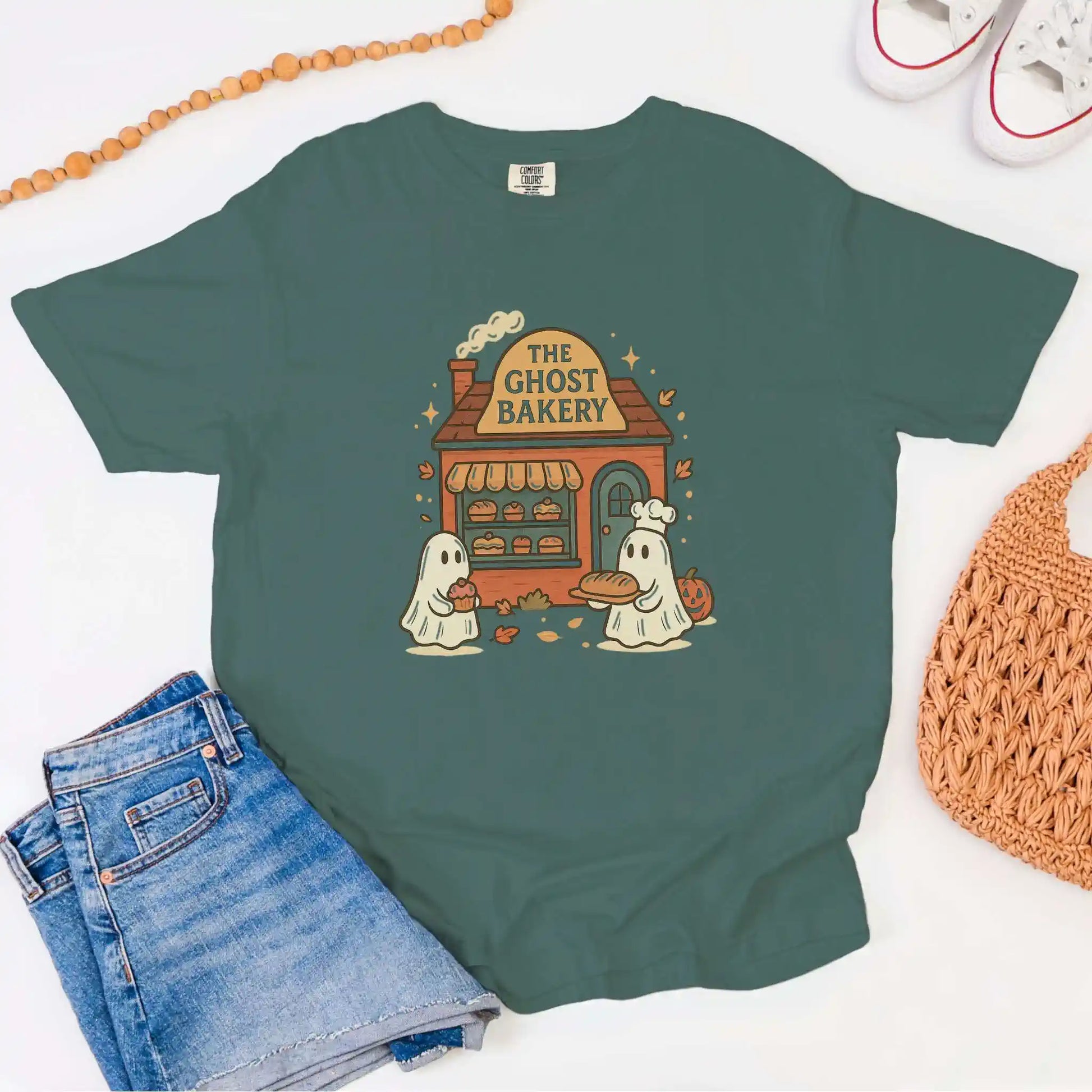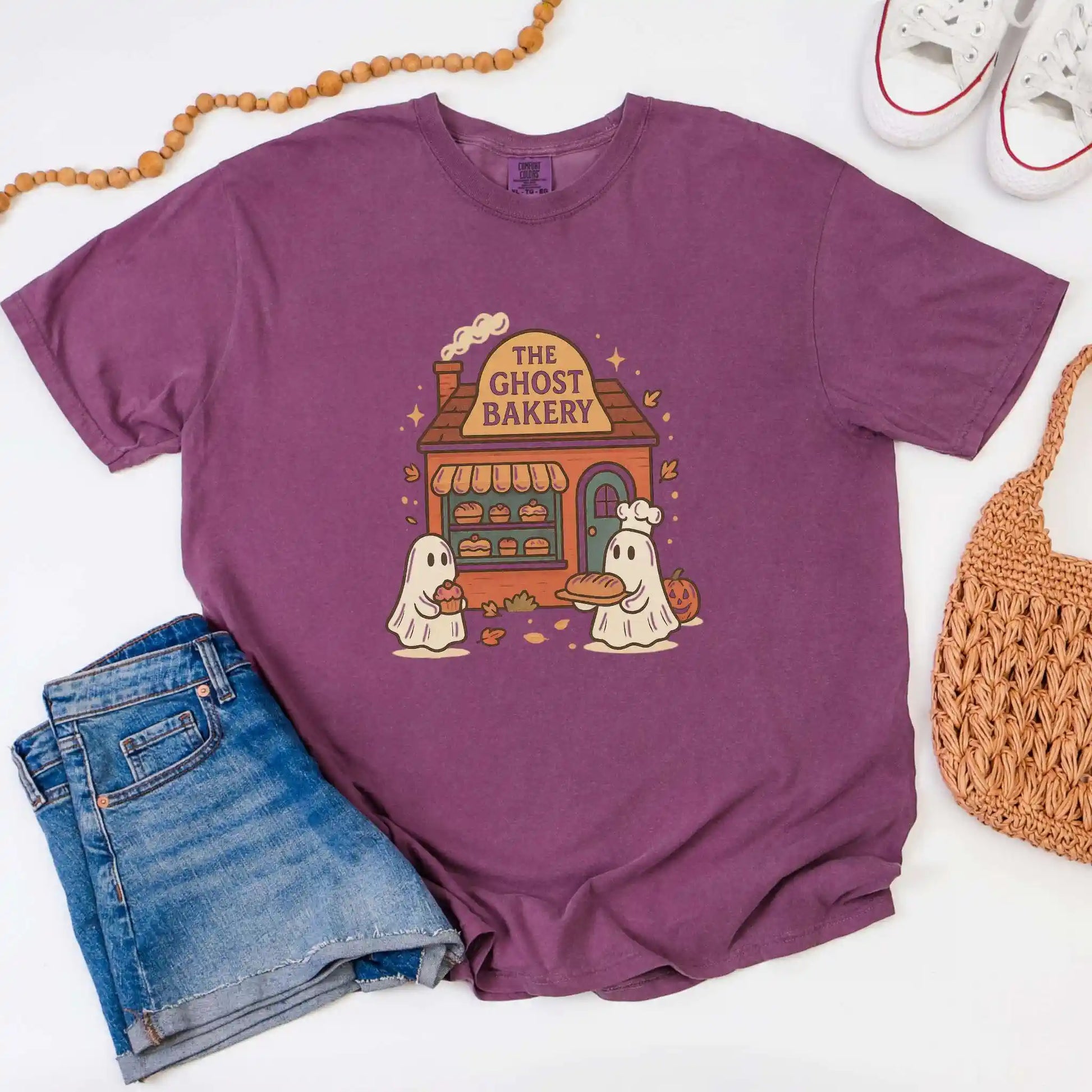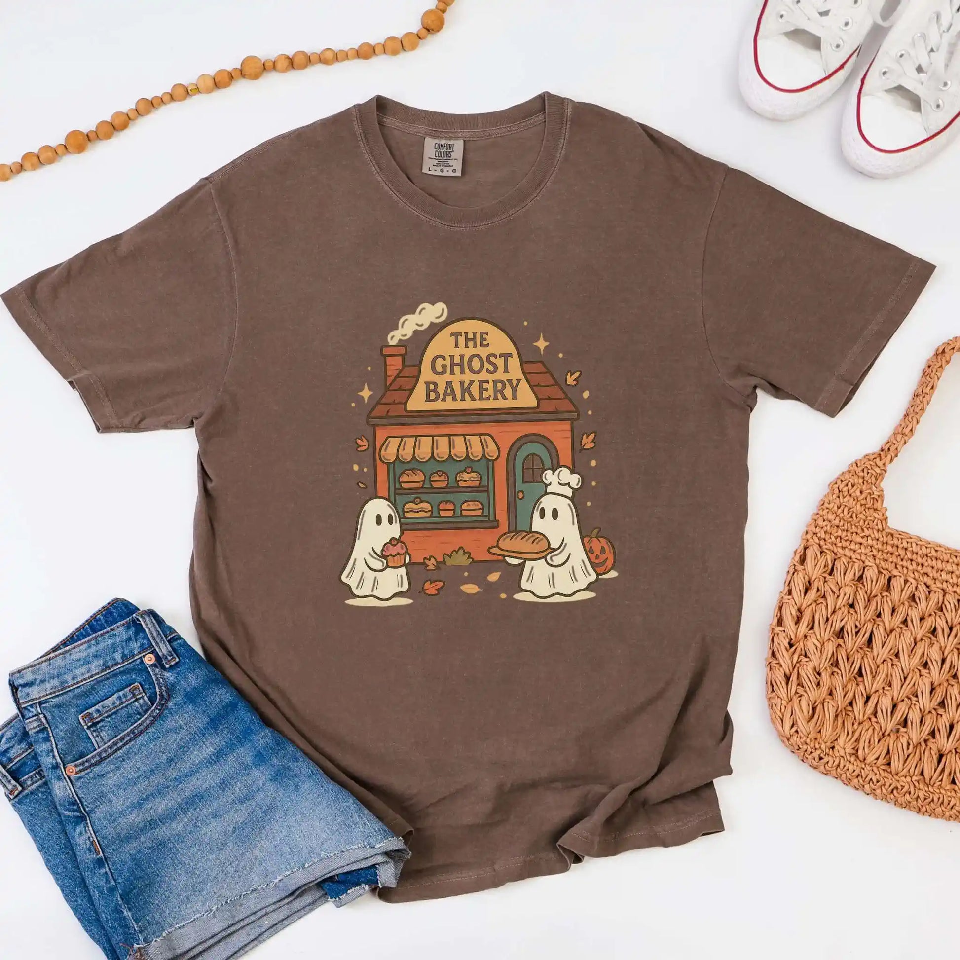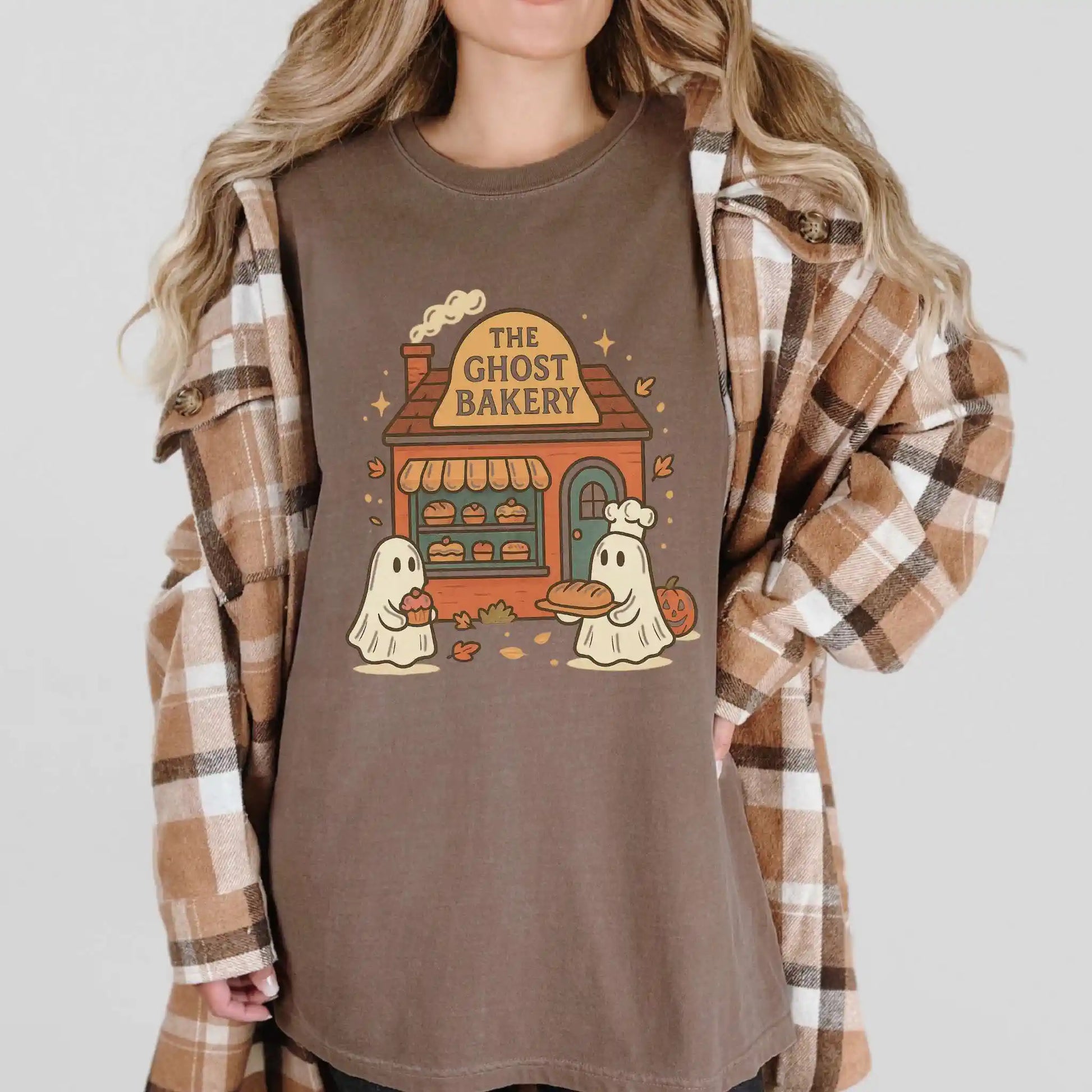 Features a front graphic of “The Ghost Bakery” storefront, complete with shelves of bread and two cheerful ghosts — one with a cupcake, the other in a baker’s hat holding a loaf. Printed on the front of a t-shirt, it’s perfect for crisp fall days, pumpkin patch strolls, or anyone who believes baking is best with a little spirit.