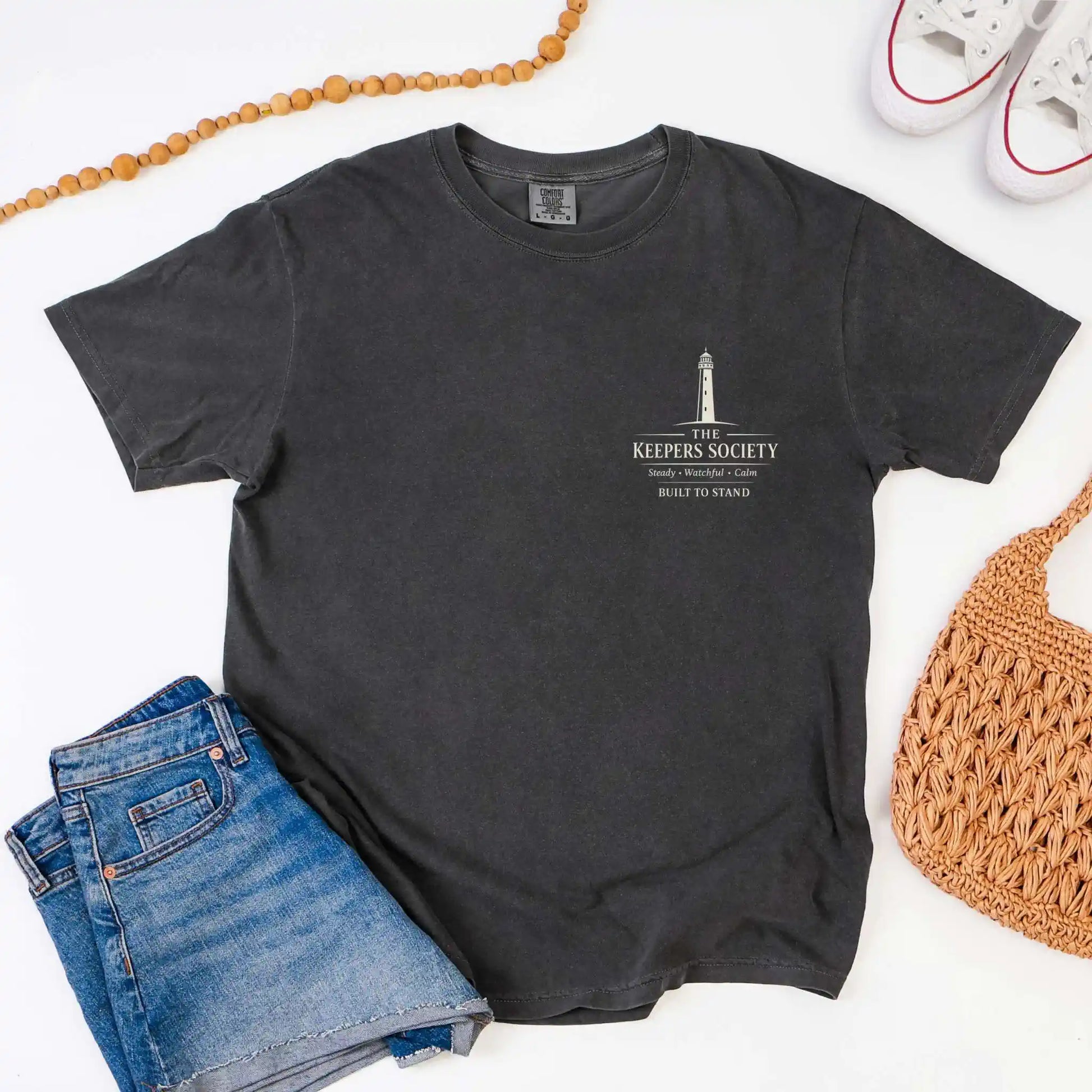 The front pocket design features a minimal lighthouse emblem with “Steady • Watchful • Calm.” The back design expands into bold stacked typography beneath a lighthouse silhouette. This front-and-back t-shirt is perfect for coastal weekends and reflective mornings.
