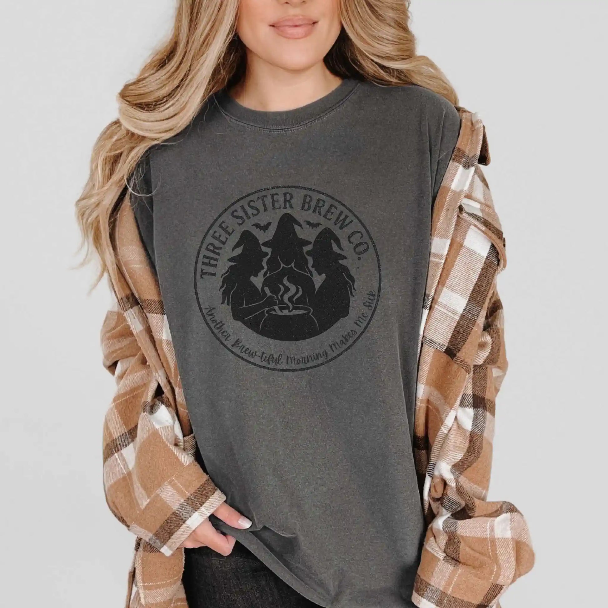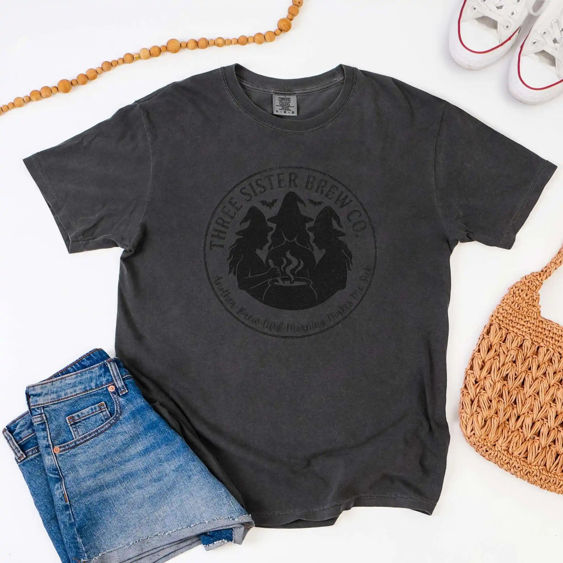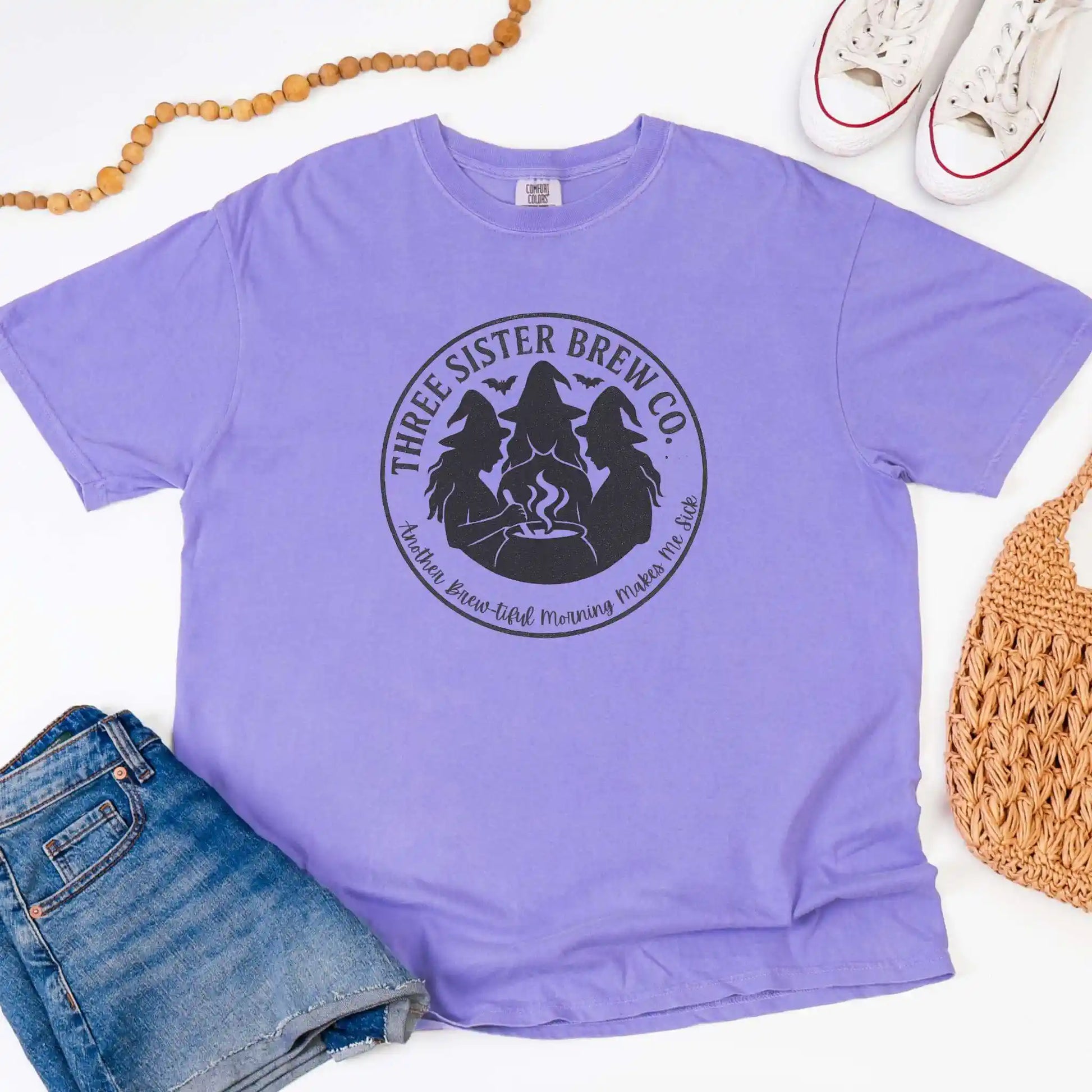 For anyone who loves a little witchcraft with their morning coffee, this design blends Halloween magic with sass. The “Three Sister Brew” circle emblem captures that cozy-creepy aesthetic for fall mornings and gatherings with friends.