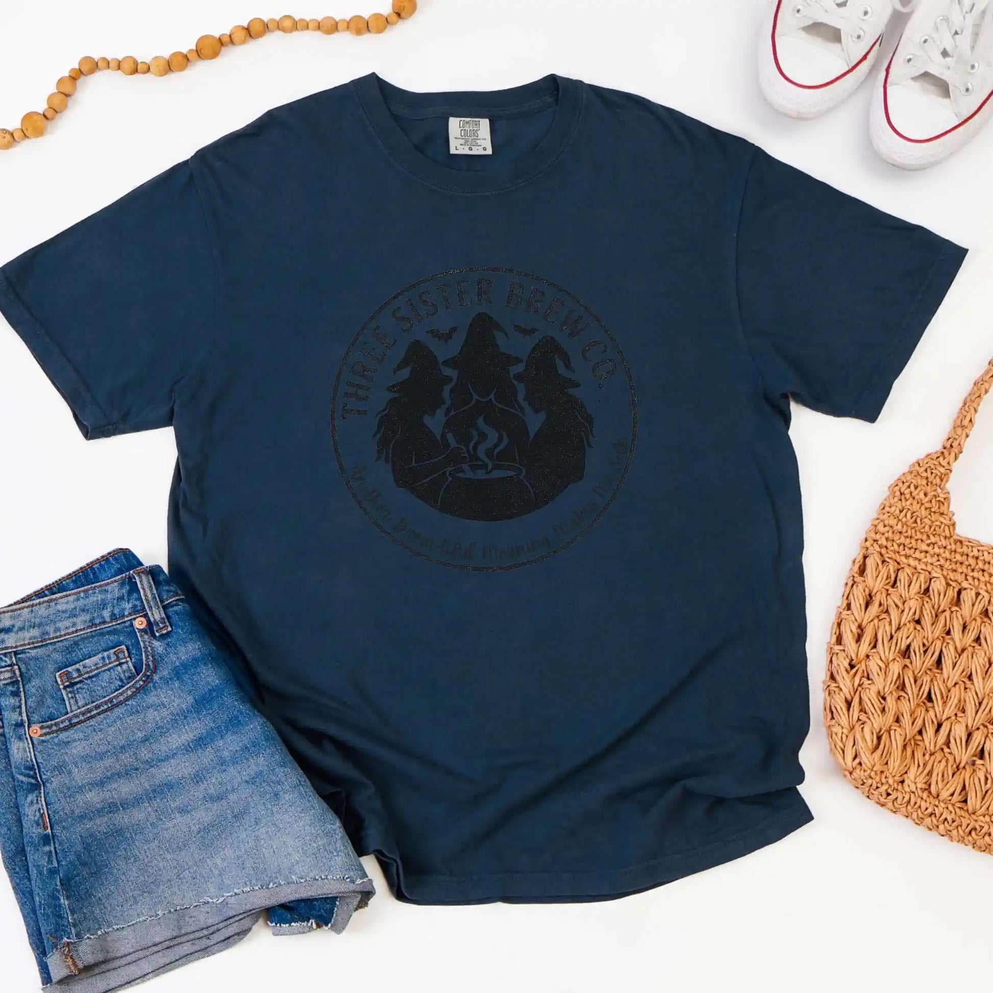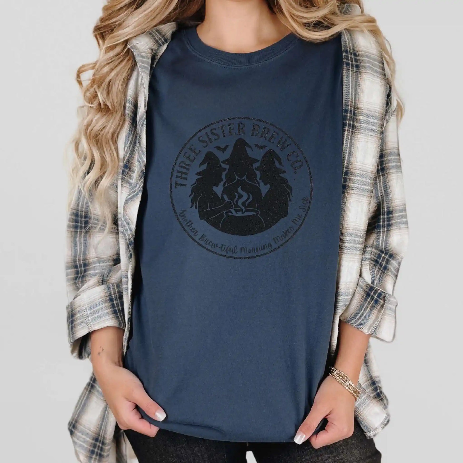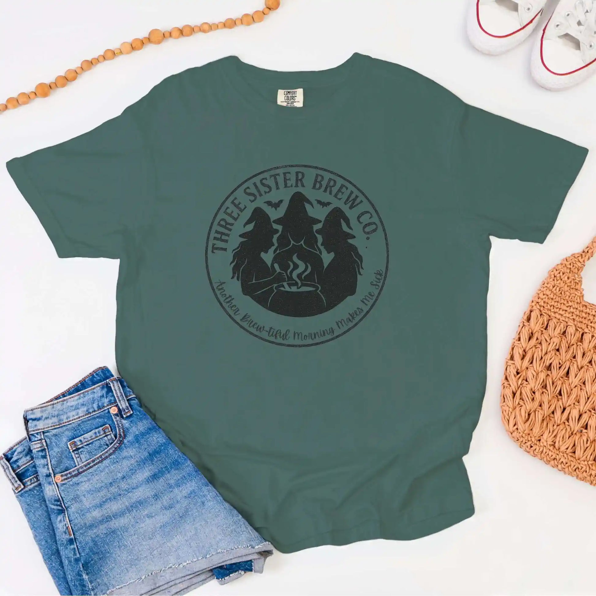 For anyone who loves a little witchcraft with their morning coffee, this design blends Halloween magic with sass. The “Three Sister Brew” circle emblem captures that cozy-creepy aesthetic for fall mornings and gatherings with friends.