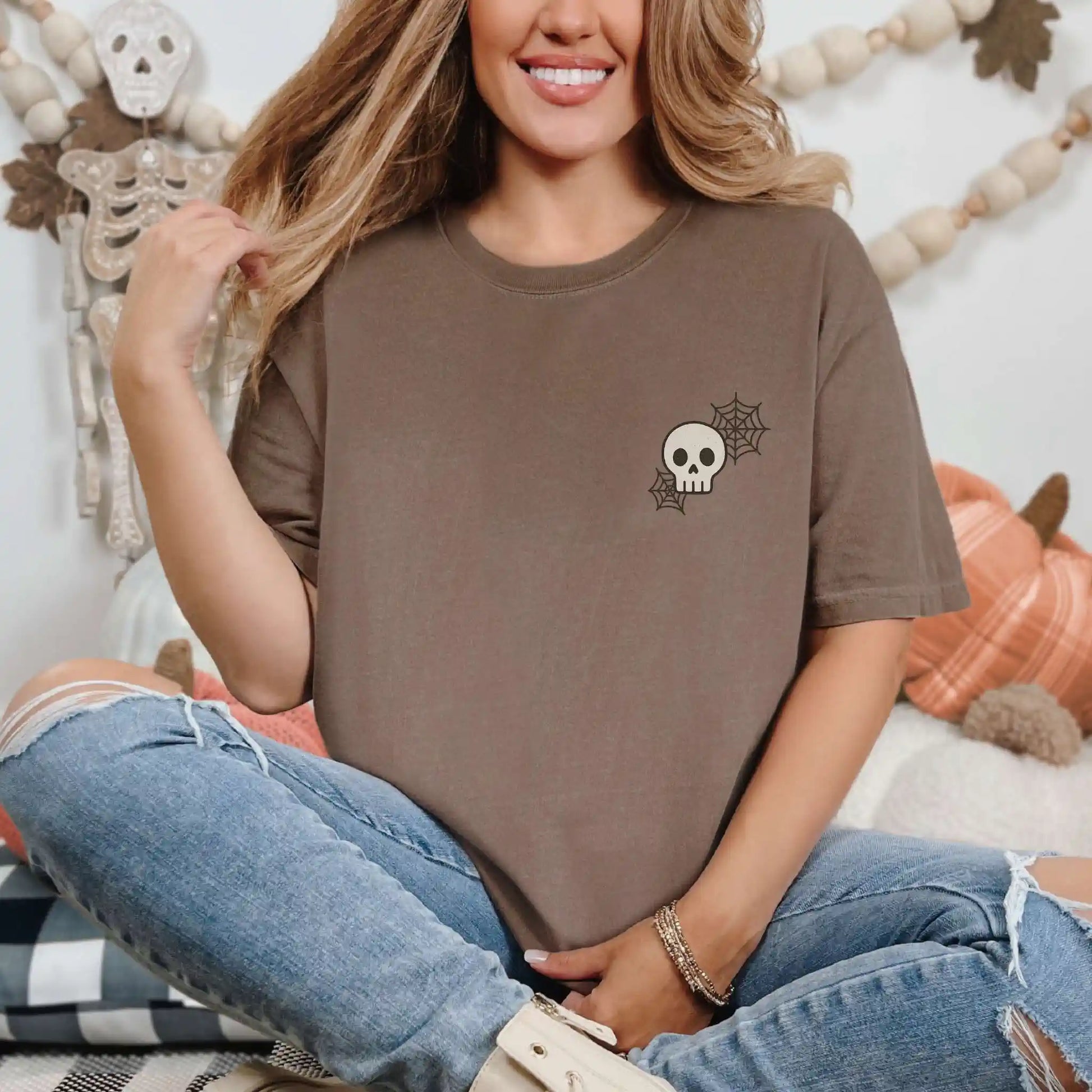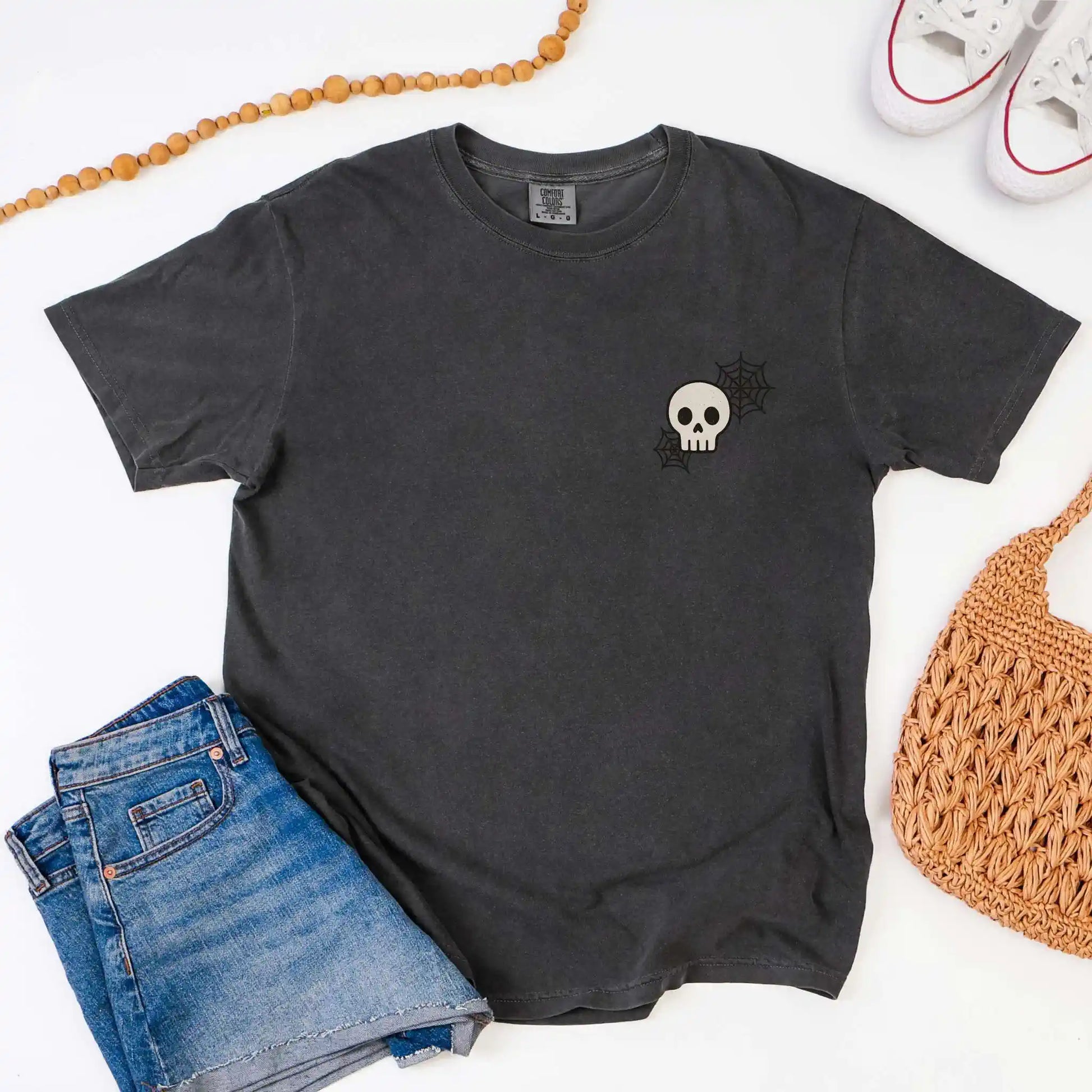 The front graphic features a small skull surrounded by cobwebs, placed at the corner for a unique look. Printed on the front of a soft t-shirt, this design is great for casual October outfits, layering, or Halloween parties where you want a low-key spooky vibe.