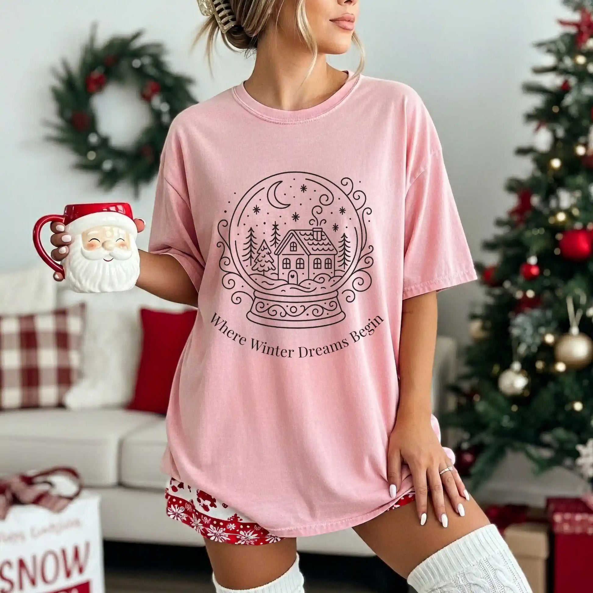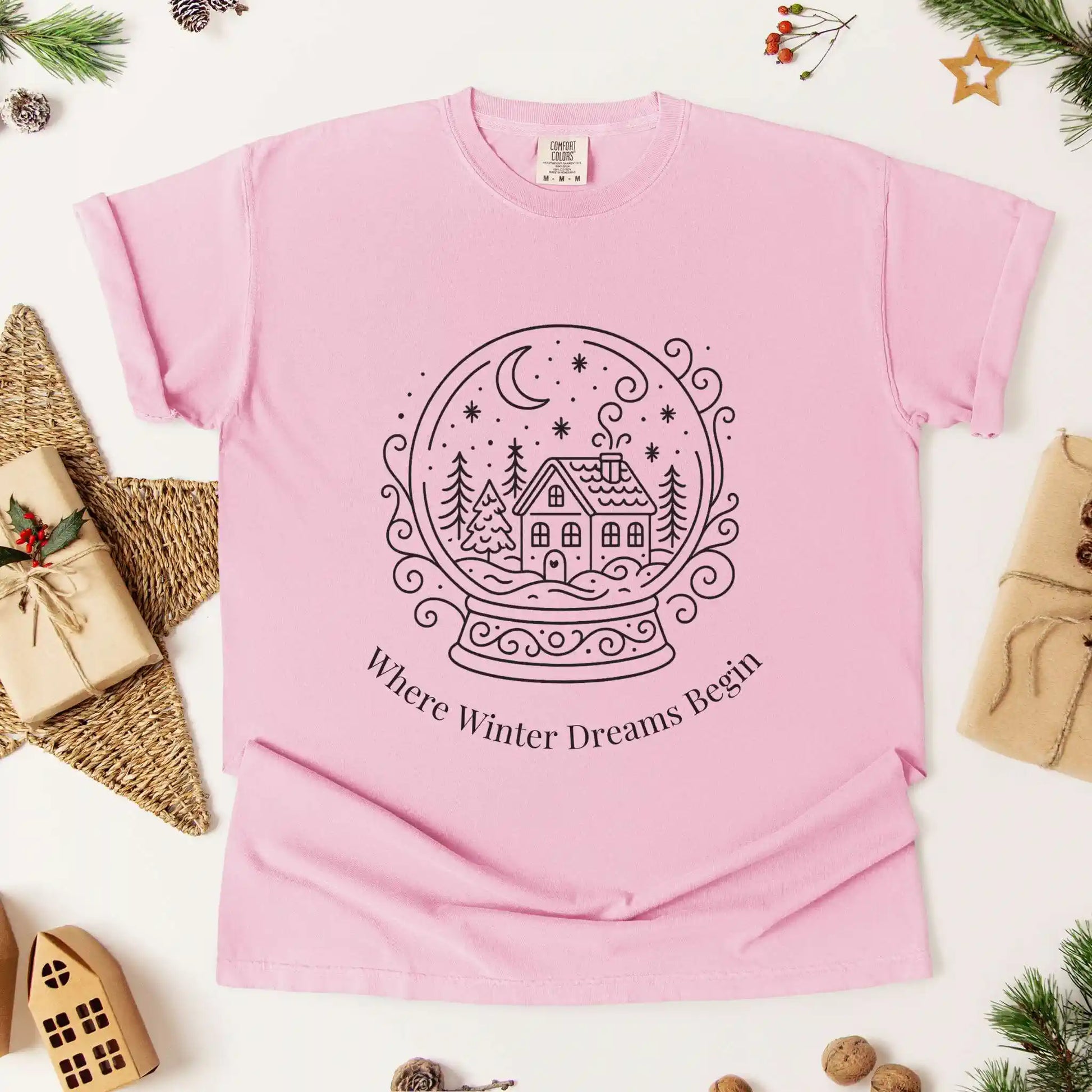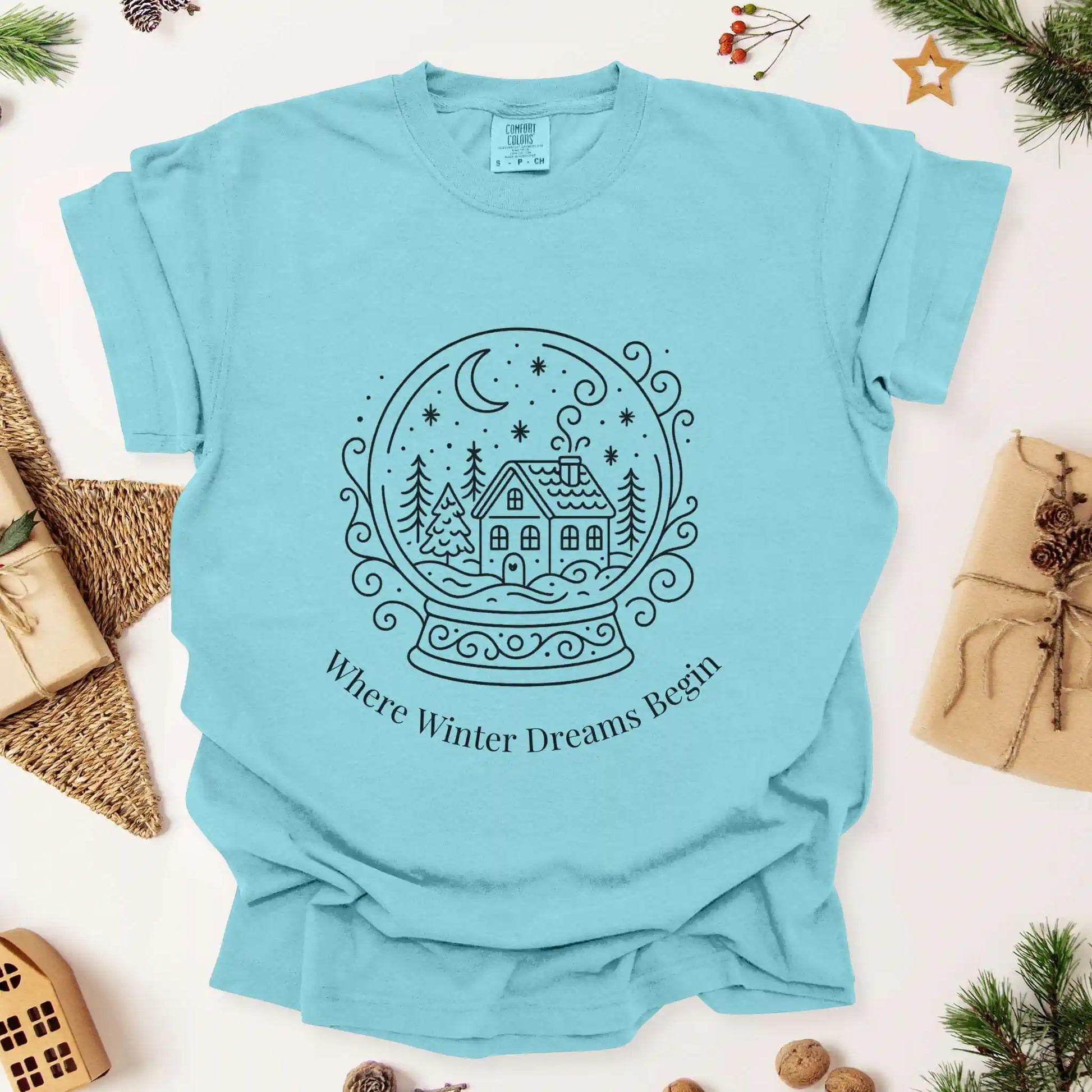 Our “Where Winter Dreams Begin” tee captures the quiet magic of the holidays with a timeless snow globe illustration a cozy home surrounded by snowy trees under a crescent moon. It’s simple, elegant, and full of wintry charm for those who love the stillness of the season.