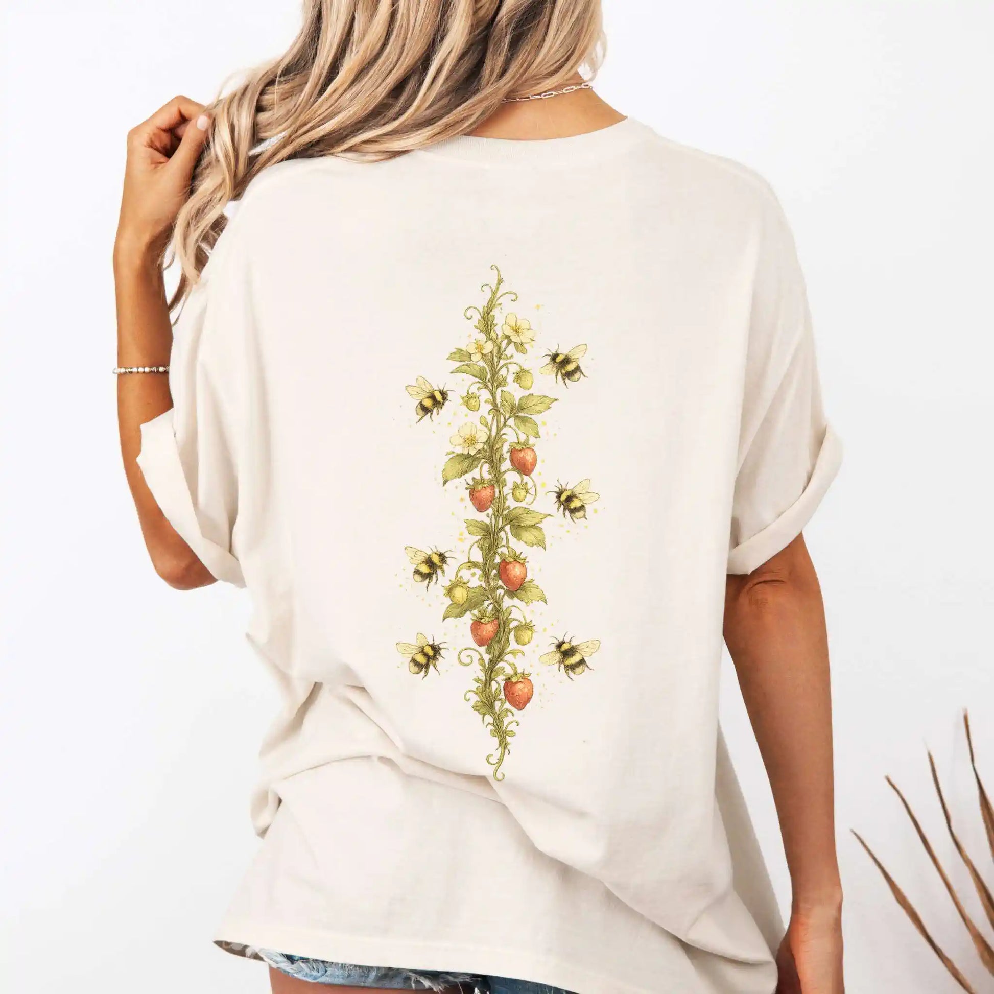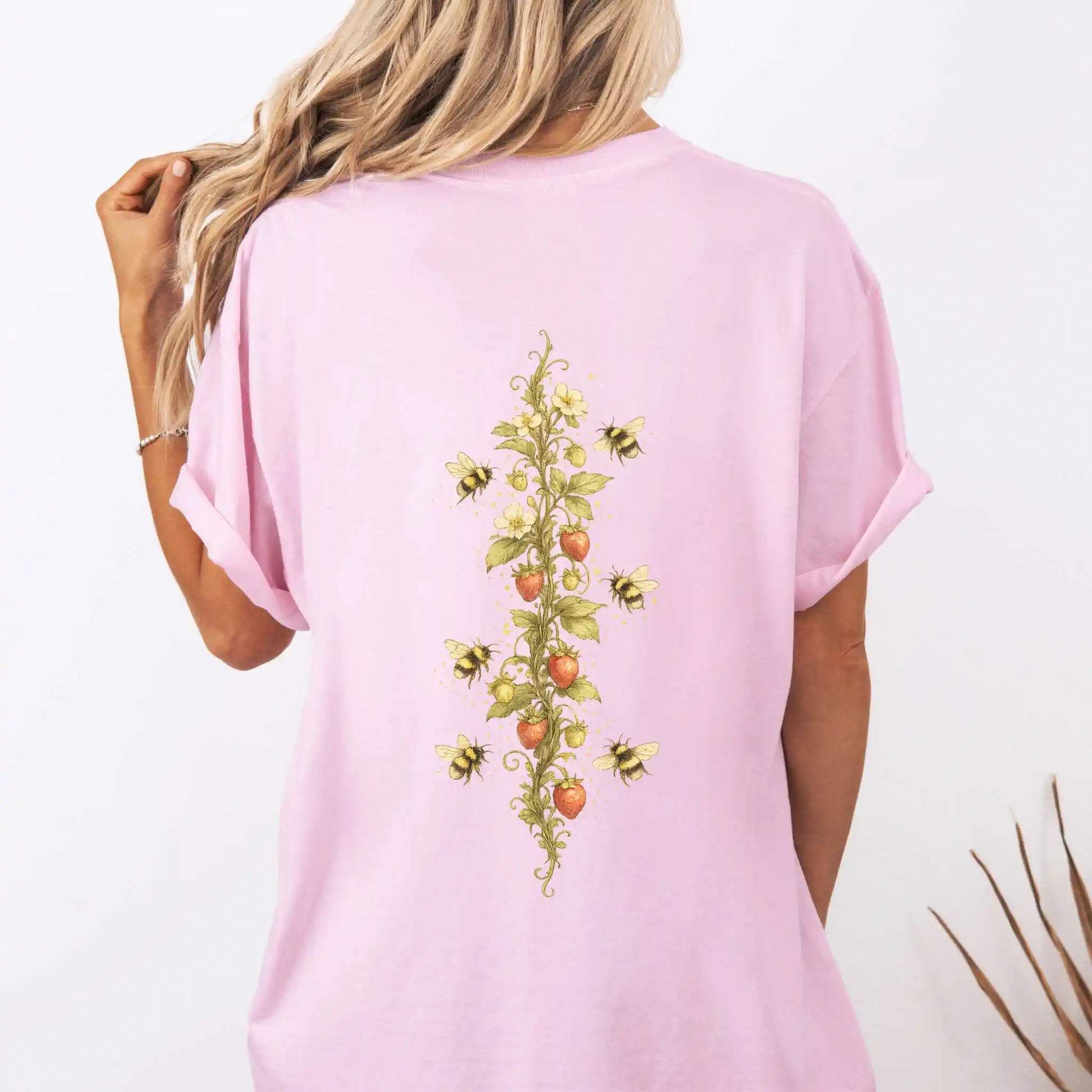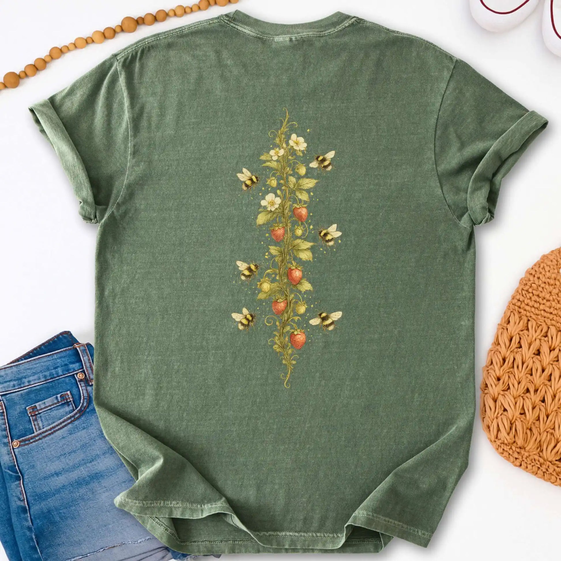The front features a detailed honeybee resting on a ripe strawberry, surrounded by leaves and blossoms. The back showcases a vertical botanical vine with blooming flowers, strawberries, and honeybees in motion. This front-and-back design is printed on a t-shirt and is ideal for everyday wear or peaceful outdoor moments.