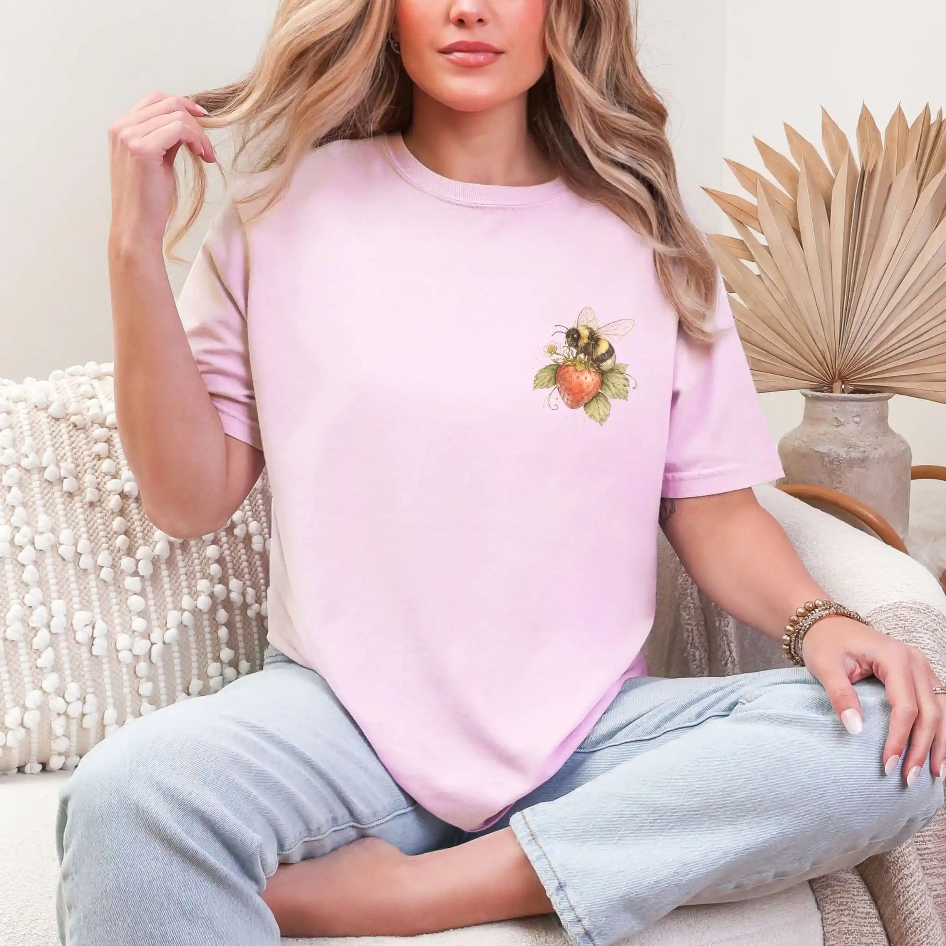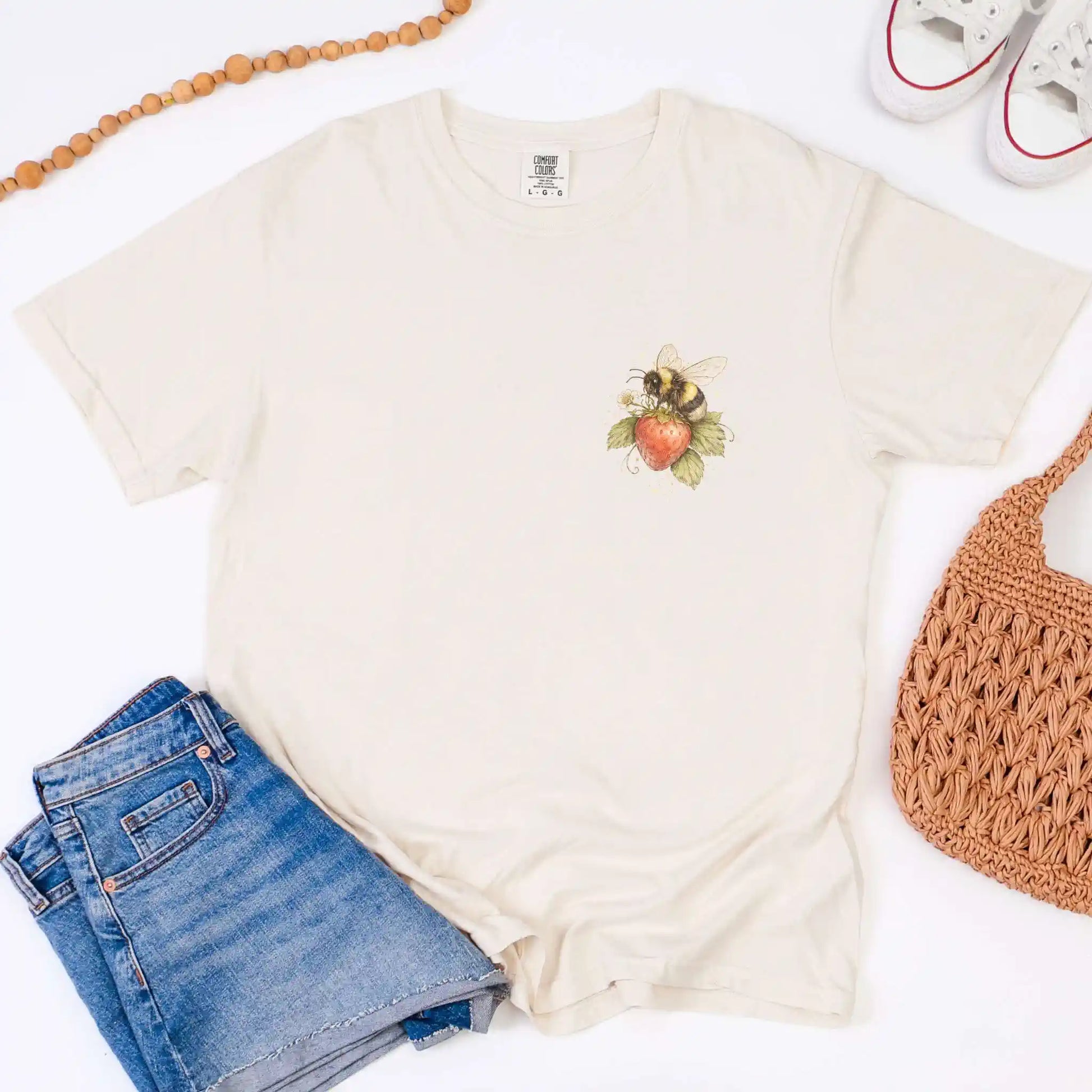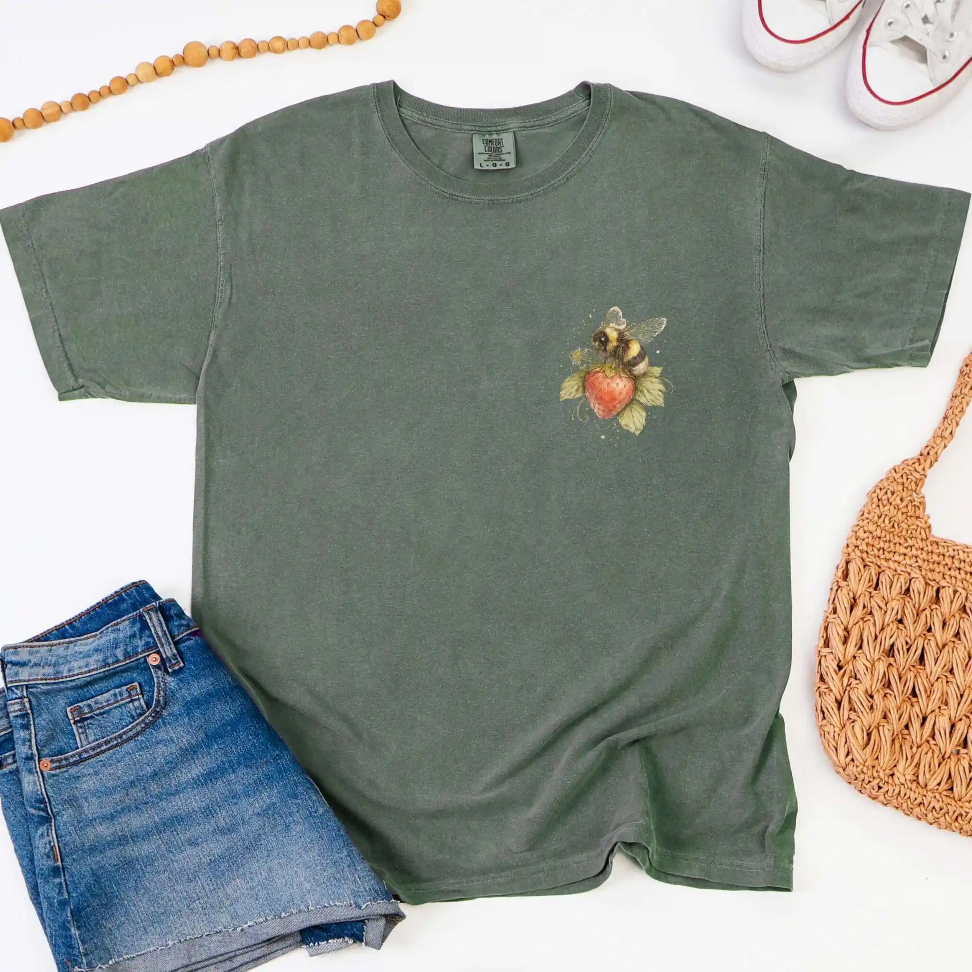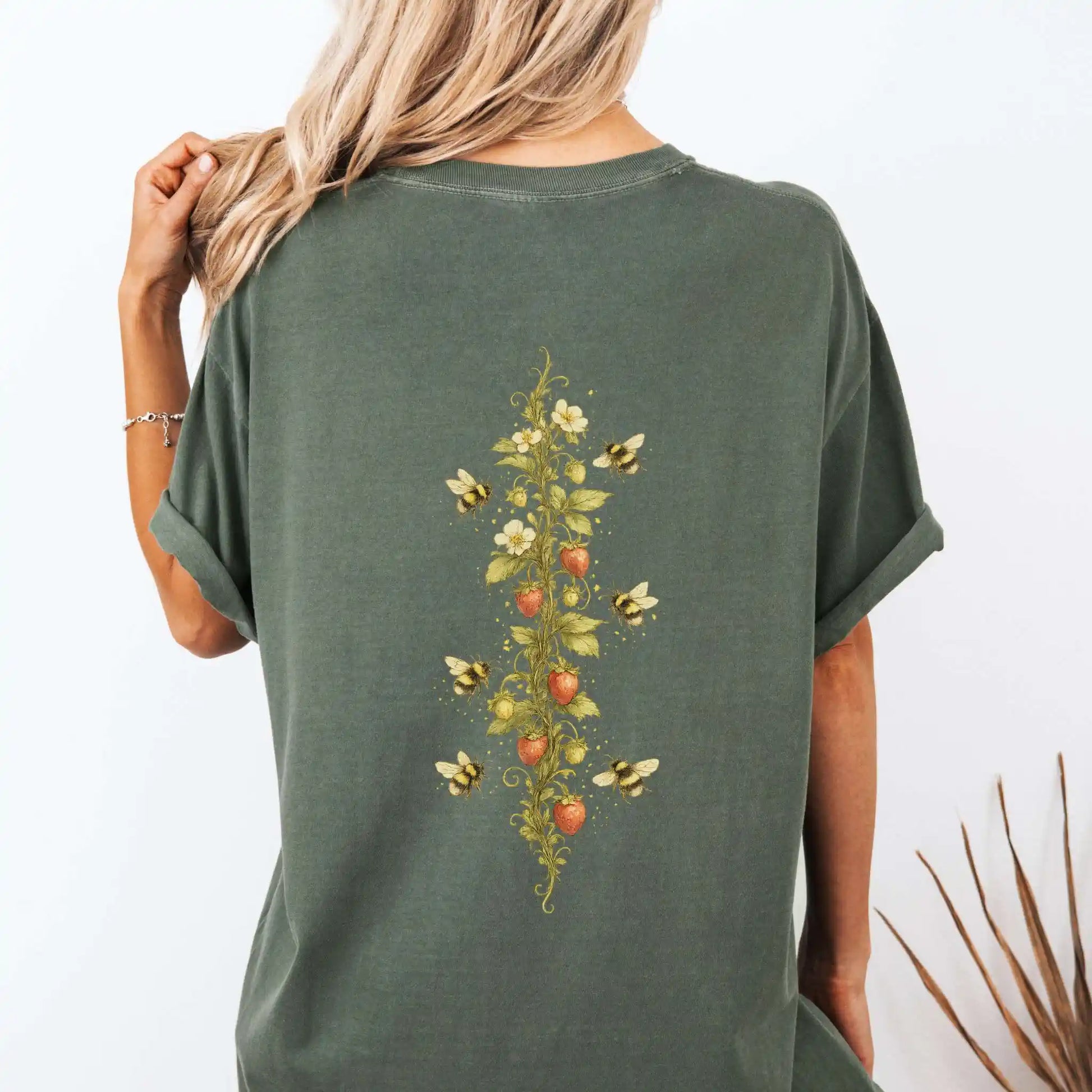 The front features a detailed honeybee resting on a ripe strawberry, surrounded by leaves and blossoms. The back showcases a vertical botanical vine with blooming flowers, strawberries, and honeybees in motion. This front-and-back design is printed on a t-shirt and is ideal for everyday wear or peaceful outdoor moments.