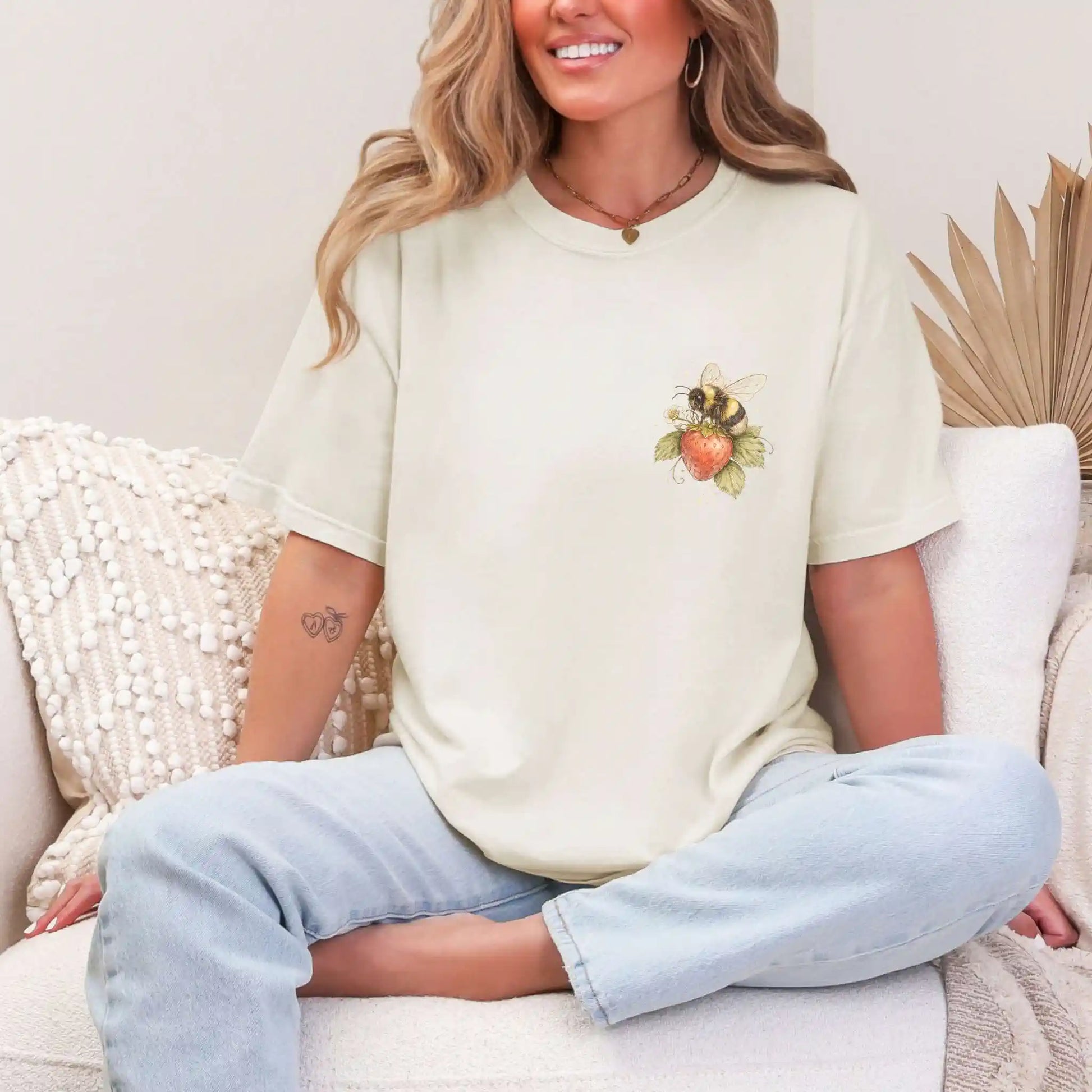 Our Wild Strawberry & Honeybee design is a quiet celebration of growth, patience, and the beauty found in tending small things. It reflects a love for gardens, gentle rhythms, and moments shaped by care and attention. This botanical bee graphic tee feels rooted in slow living and the calm that comes from staying connected to nature.