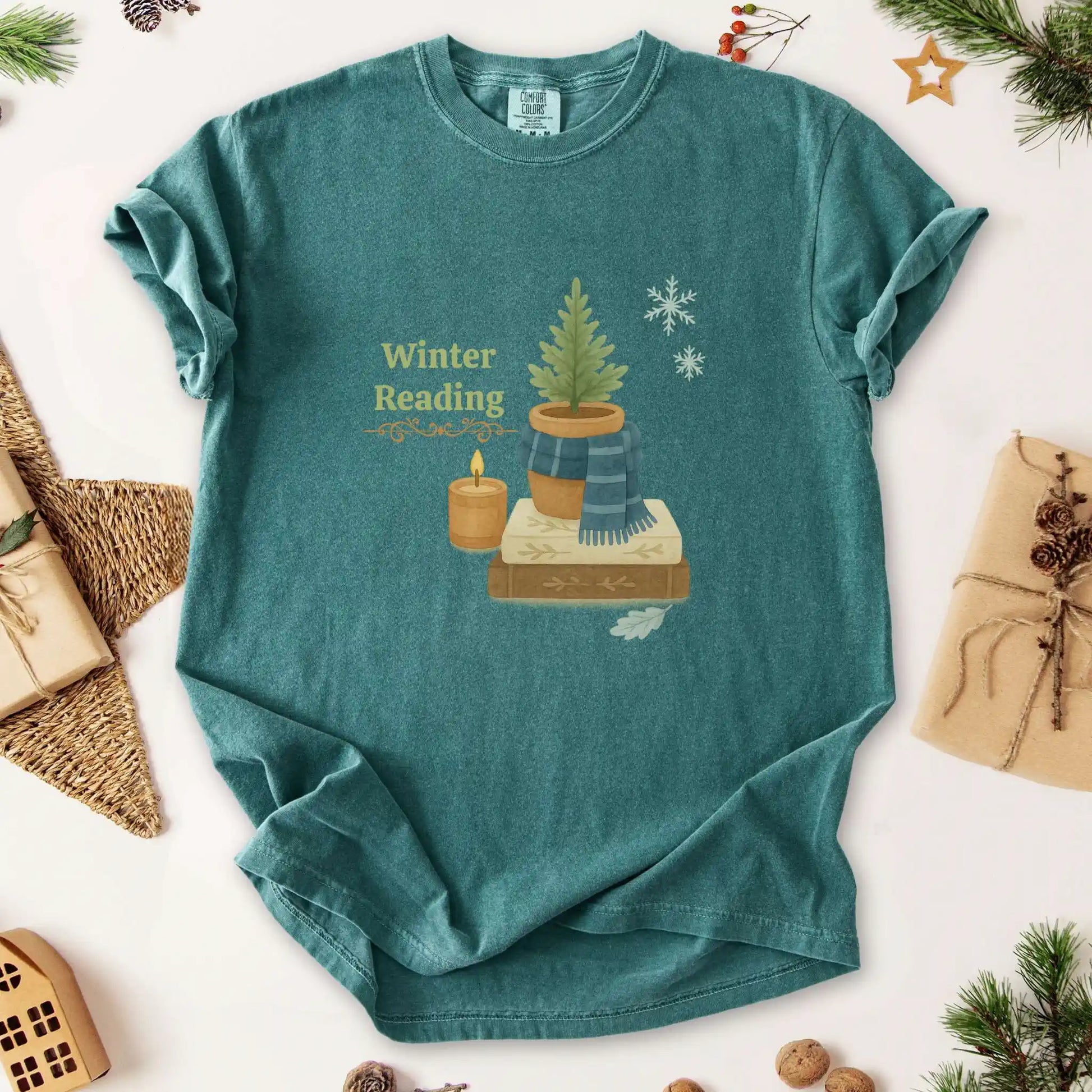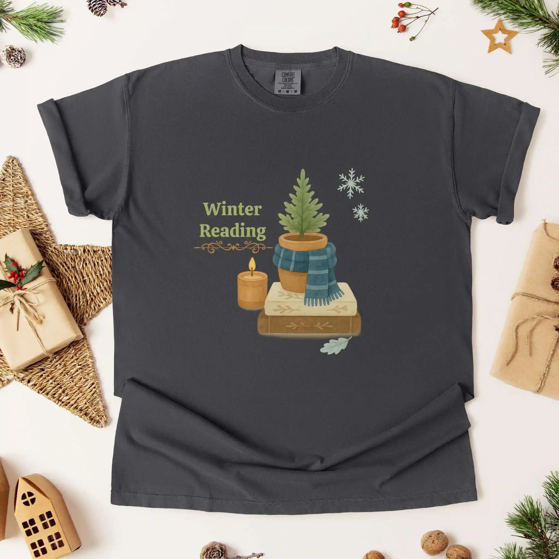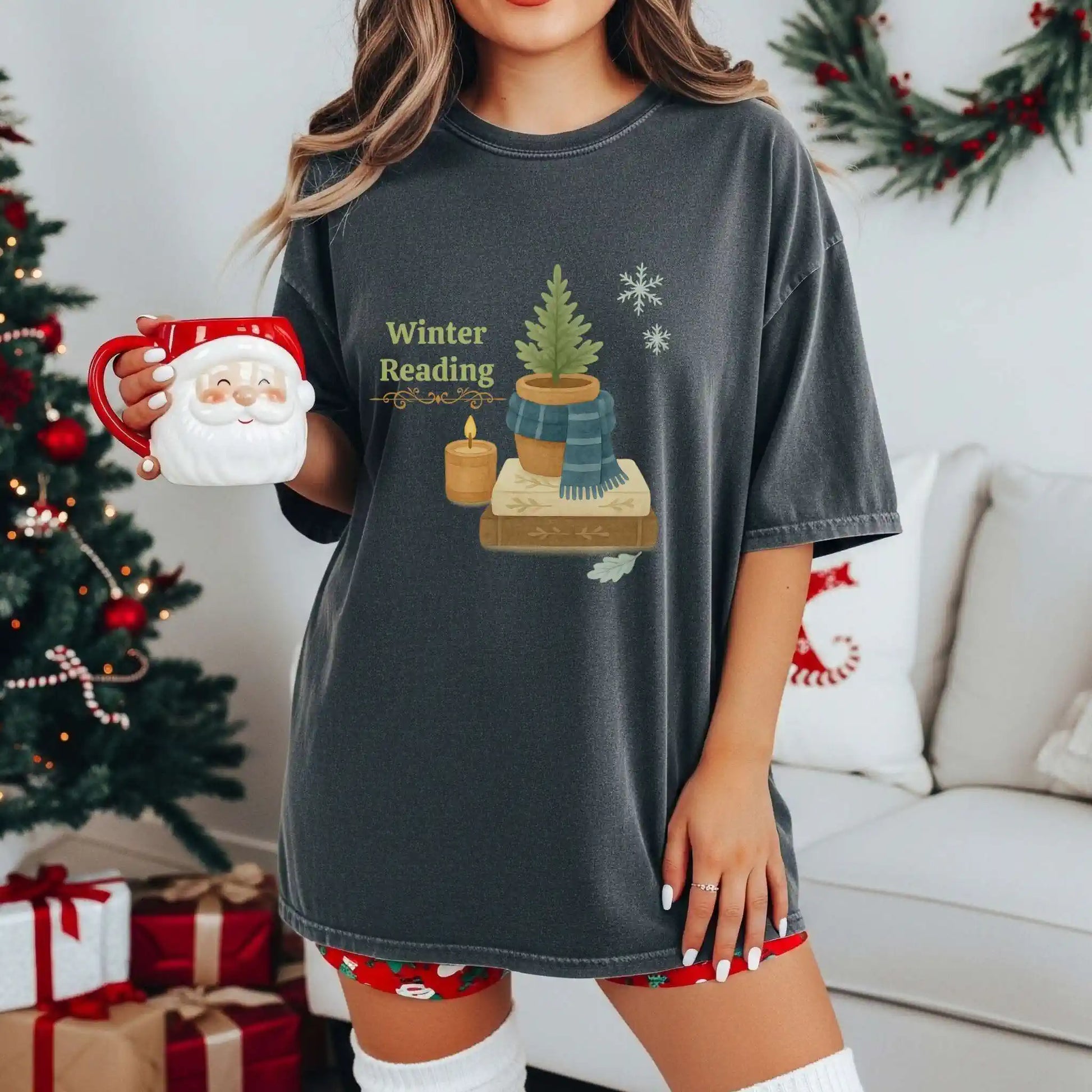 The front graphic features a stack of books topped with a potted evergreen wrapped in a scarf, accented with snowflakes and a glowing candle. Printed on a t-shirt with a centered front design, it’s an ideal choice for book club nights, library visits, or curling up at home with a good read.