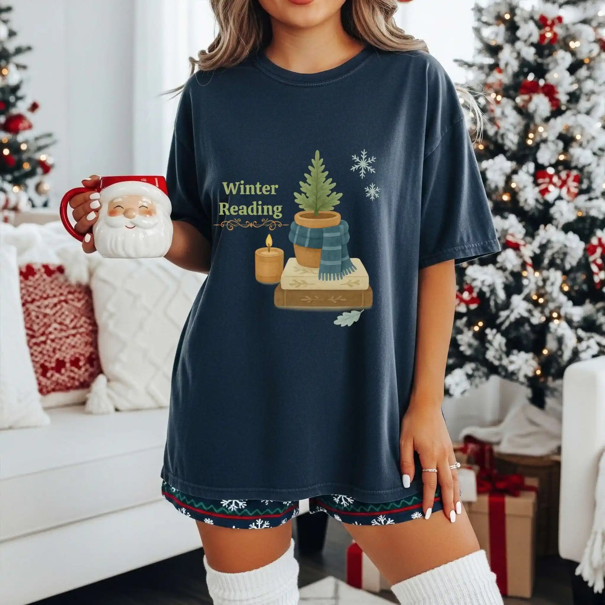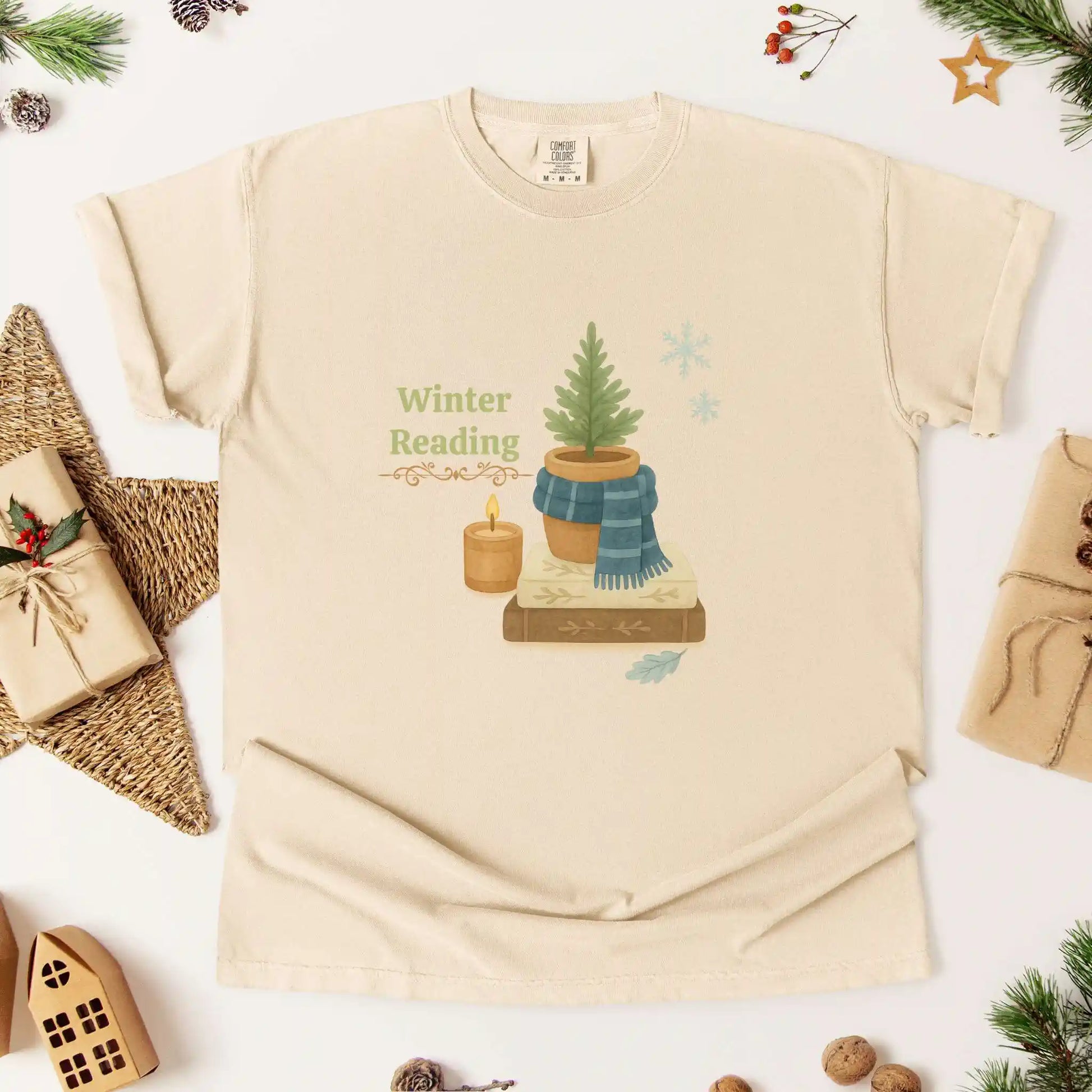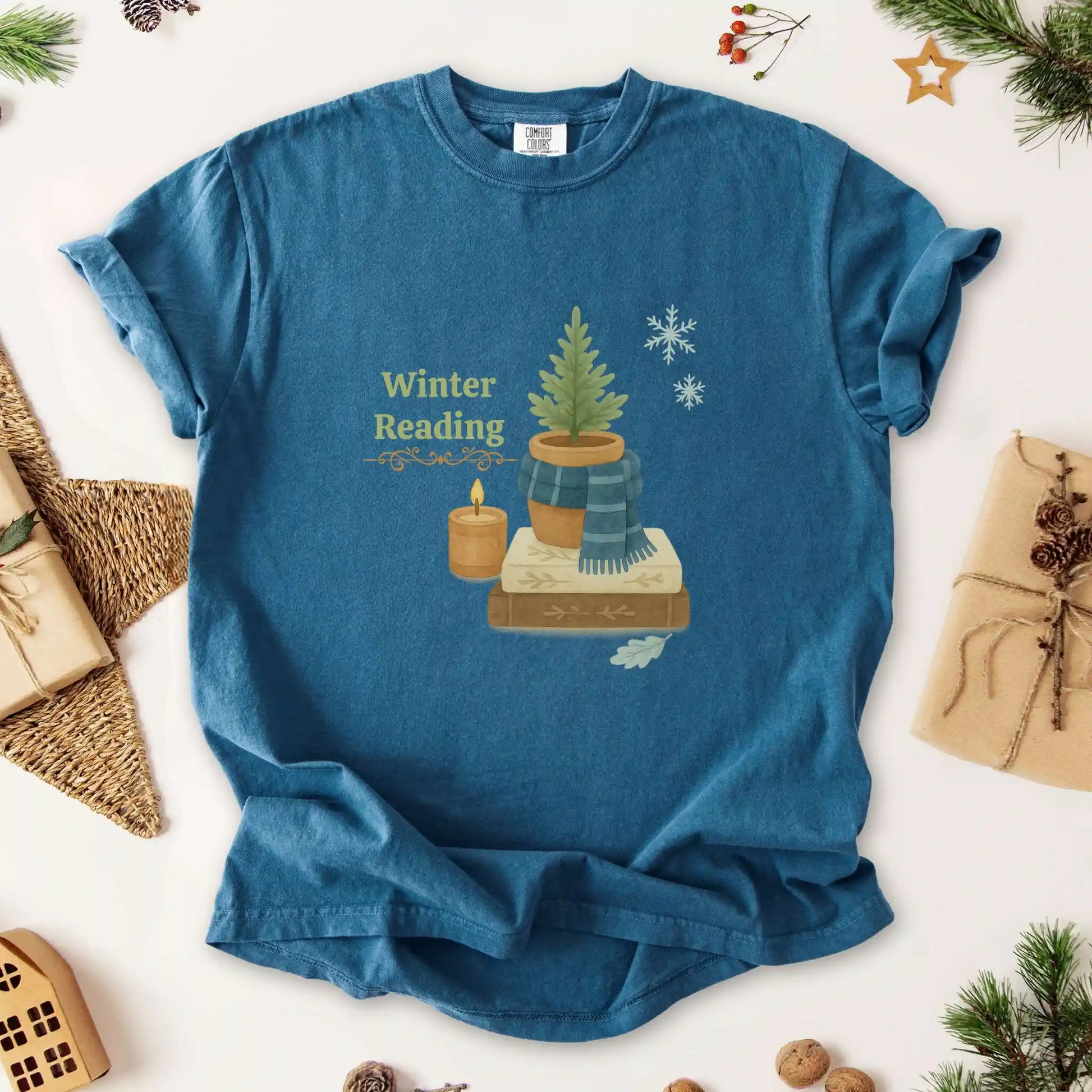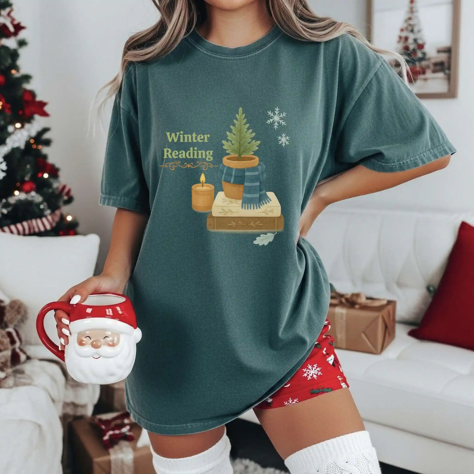 The front graphic features a stack of books topped with a potted evergreen wrapped in a scarf, accented with snowflakes and a glowing candle. Printed on a t-shirt with a centered front design, it’s an ideal choice for book club nights, library visits, or curling up at home with a good read.