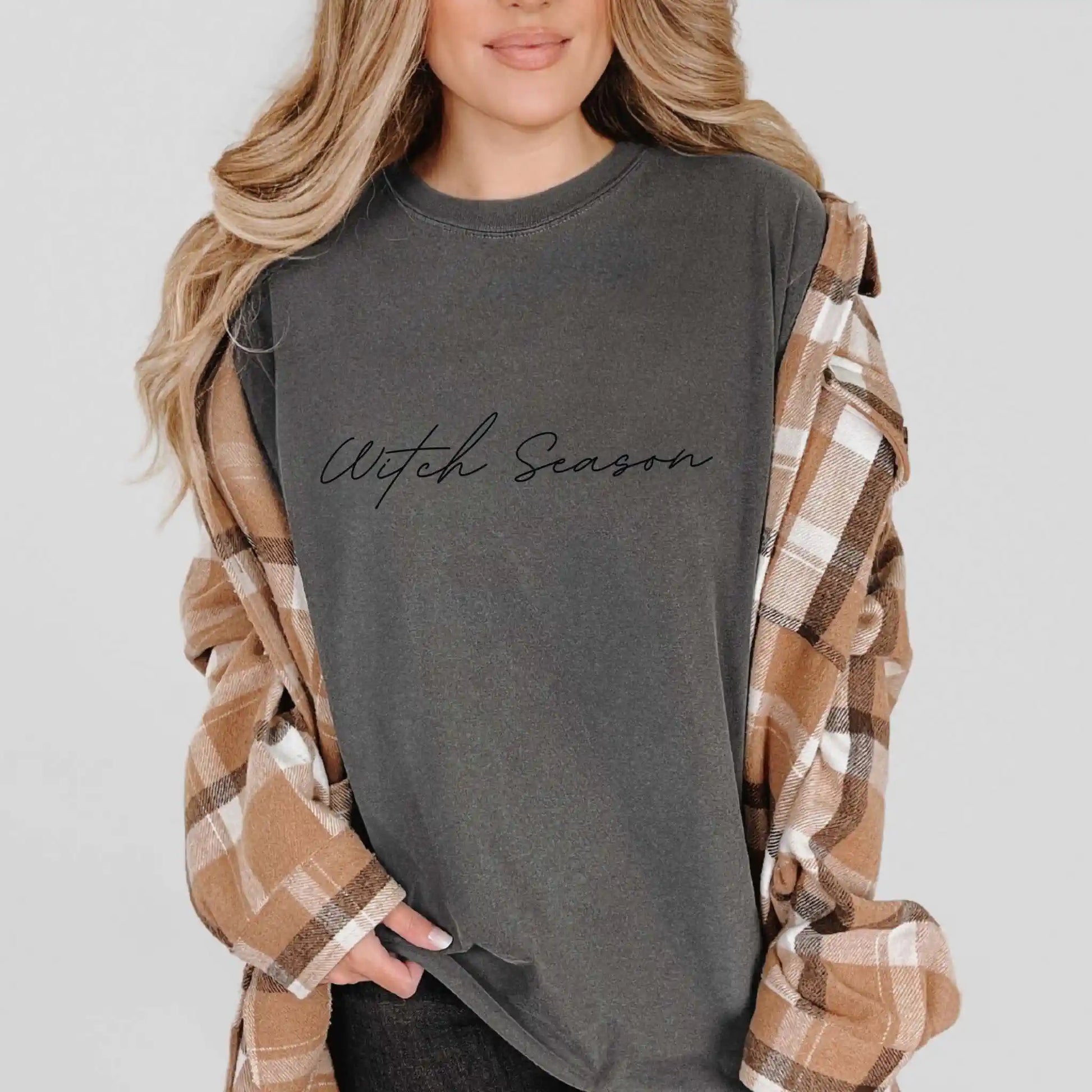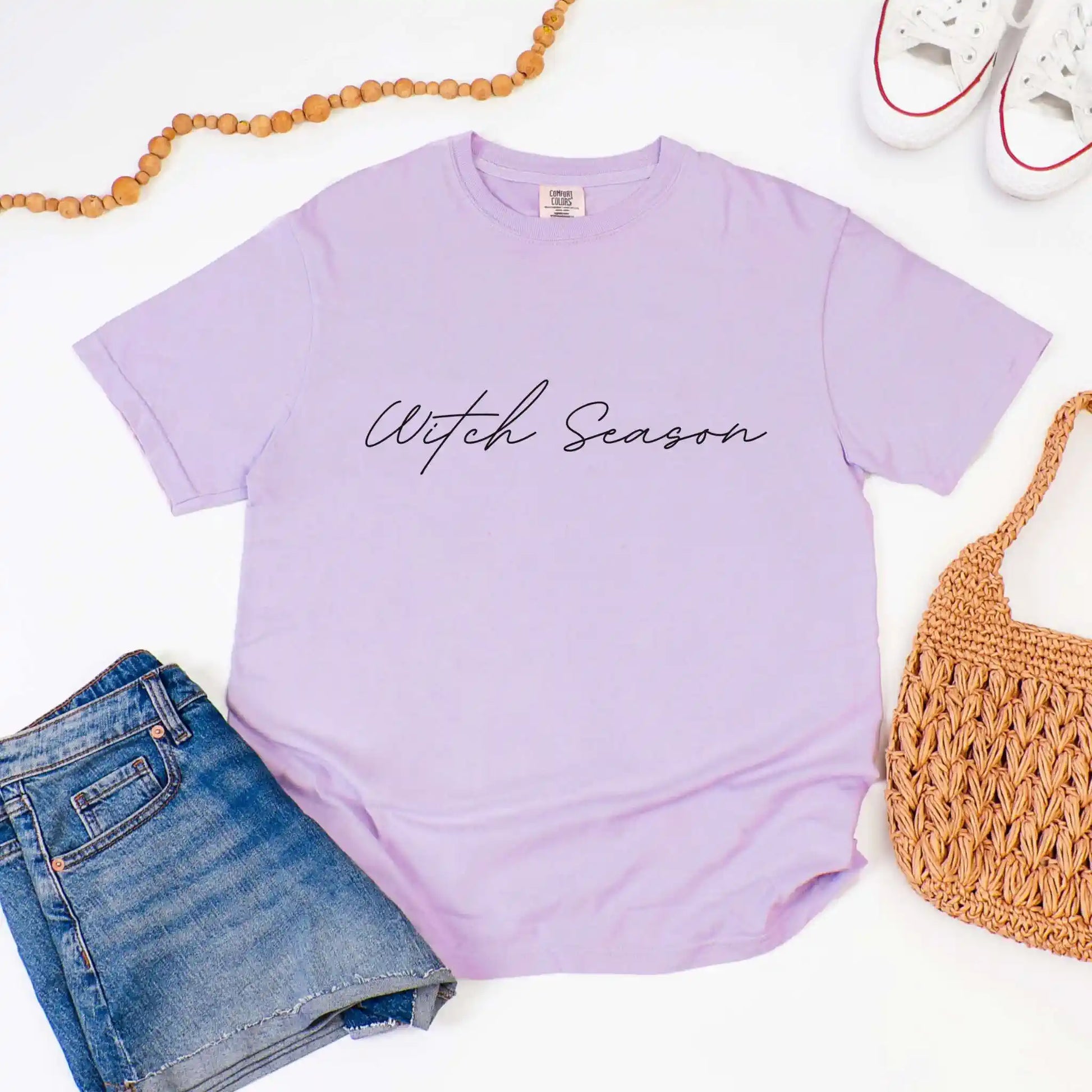 Features a clean front design with the phrase “Witch Season” in elegant, handwritten script. Printed on a classic t-shirt, it’s perfect for Halloween parties, casual autumn days, or any time you want to let your witchy side shine.